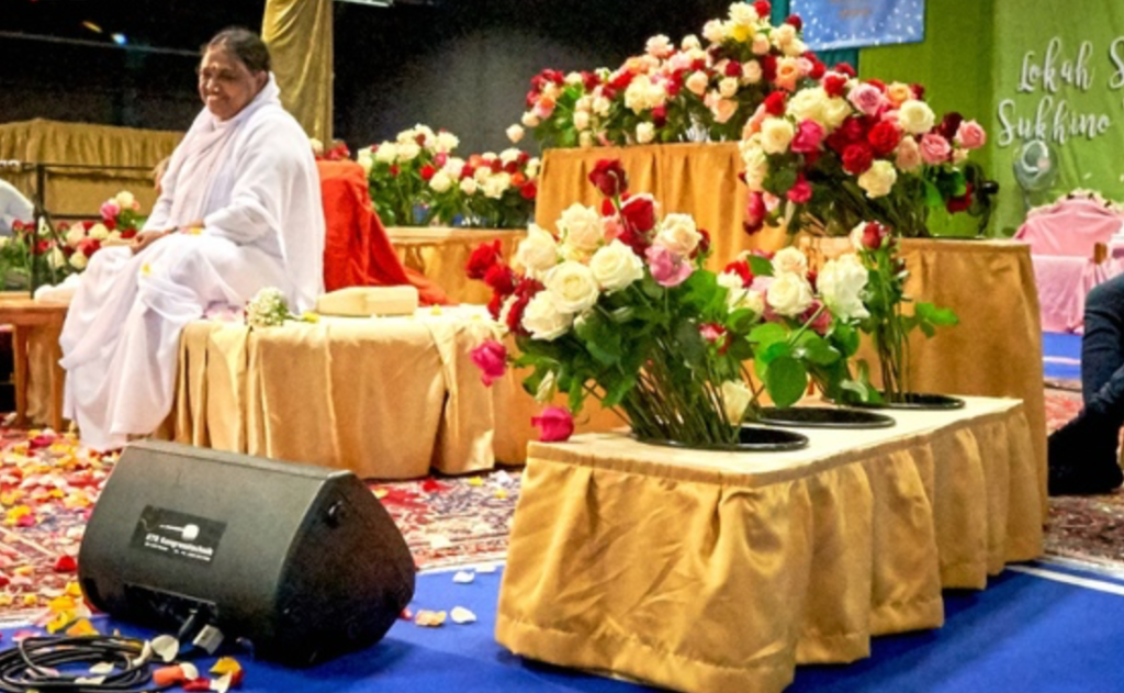 People wept, people brought gifts, people fainted …everywhere was human emotion, human flow. When it came to my turn I was directed to the stage and sat on the small pillow near her feet. For a few minutes I took in the gusts of wind from the fans in my face and drifted in & out of my body. But I was jolted back by one of her attendants as he pulled me into Amma’s arms. Amma reached for me with a strong embrace, it lasted maybe a minute…she then put her face against my cheek and whispered something in my ear. It was not in the English language, but I learned later it was a mantra, a Hindu mantra to strengthen my connection to Christ. She then made some sort of soothing noise and stroked my head and hair. I was then quickly passed to a waiting attendant.
